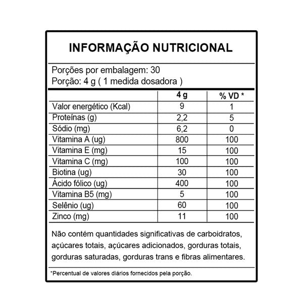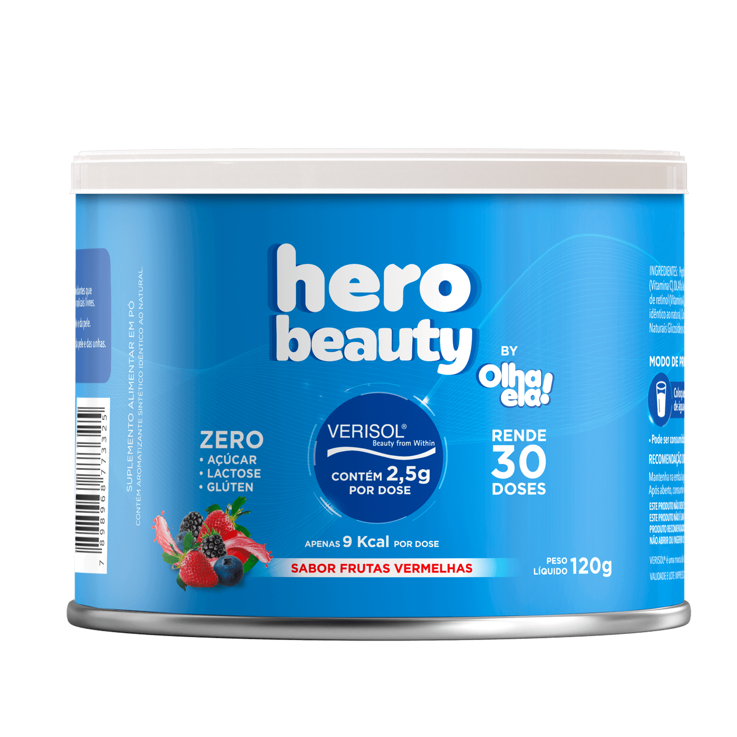 Ingredientes: Peptídeos bioativos de colágeno hidrolisado VERISOL® 2,5 gramas, hialuronato de sódio (fonte de ácido hialurônico), ascorbato de sódio (vit. C), DL alfa acetato de tocoferol (vit. E), sulfato de zinco (zinco), pantotenato de cálcio (vit. B5), palminato de retinol (vit. A), ácido fólico (vit. B9), selenito de sódio (selênio), biotina (vit. B7), aroma idêntico ao natural de frutas vermelhas, acidulante ácido cítrico, emulsificante polidextrose e goma xantana, corante natural beterraba liofilizada, antiumectante dióxido de silício e educorante natural STÉVIA E TAUMATINA.